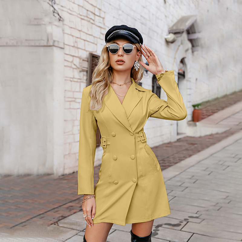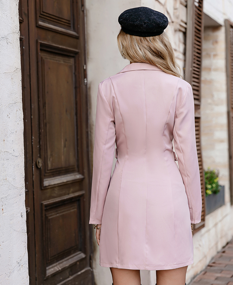 Women Belt Double Breasted Blazer Dress Office lady Dress Autumn Trench Coat Dress Business Suit Dress Pink Belted Trench Coat #1028