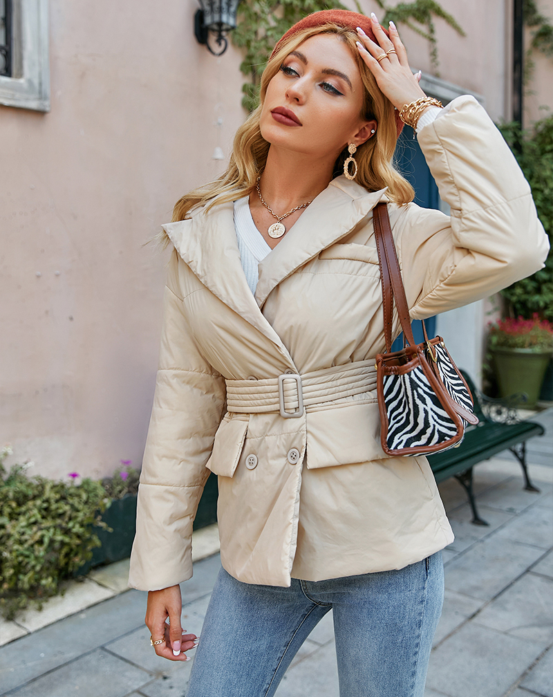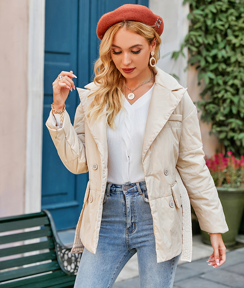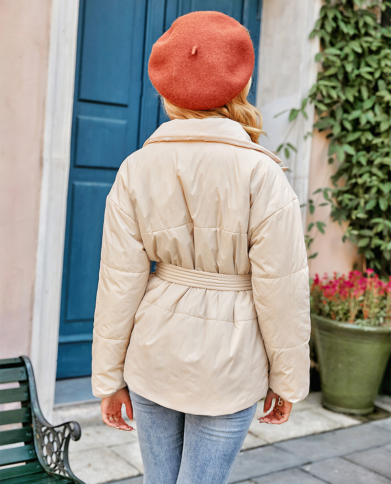 Women Beige belt Quilted Puffer Coat ladies Quilted Padded Coat sheath short Puffer jackets Warm Winter Coat #1048