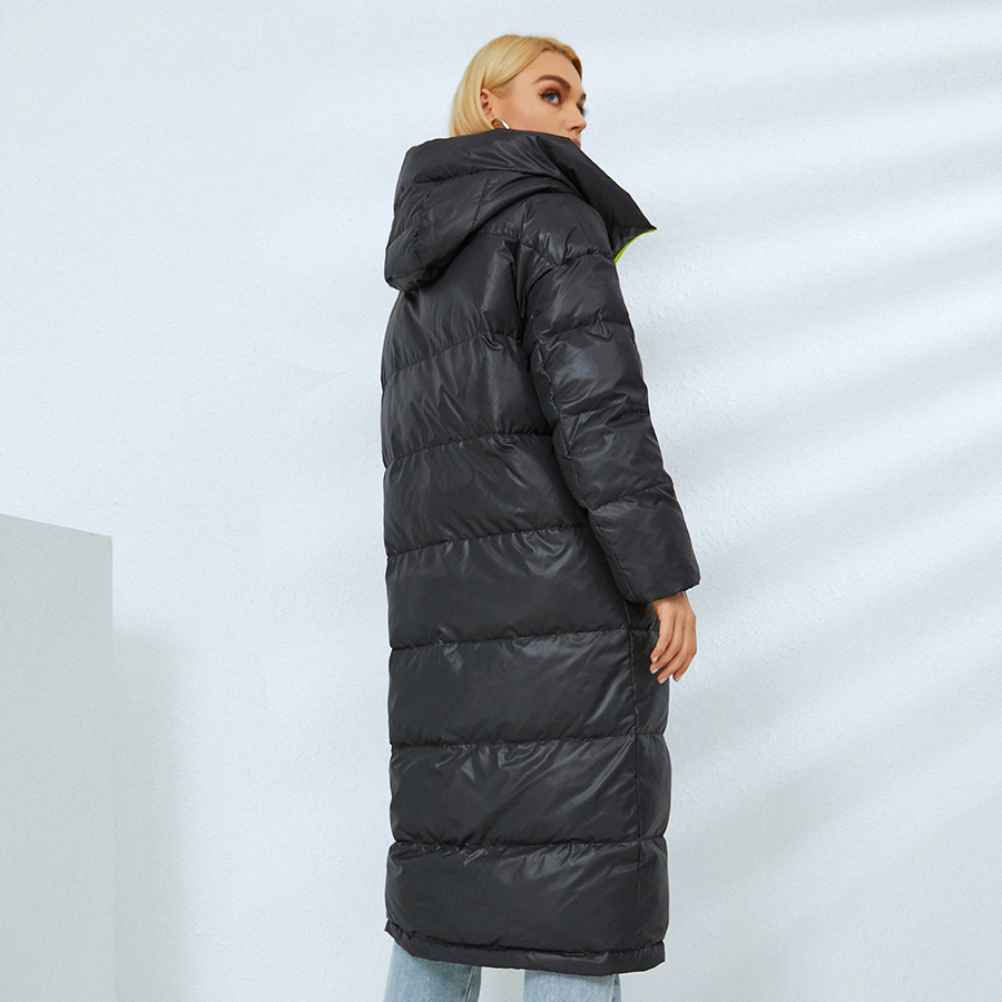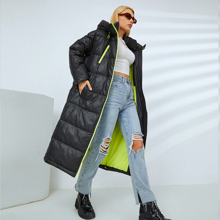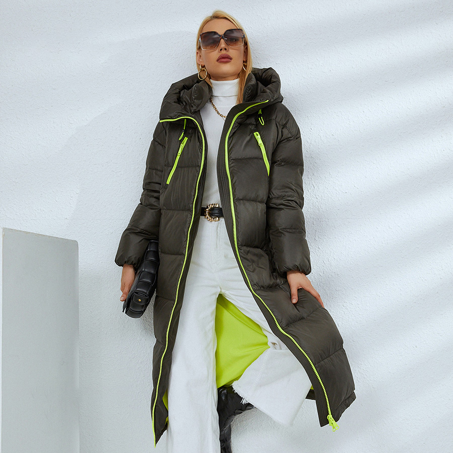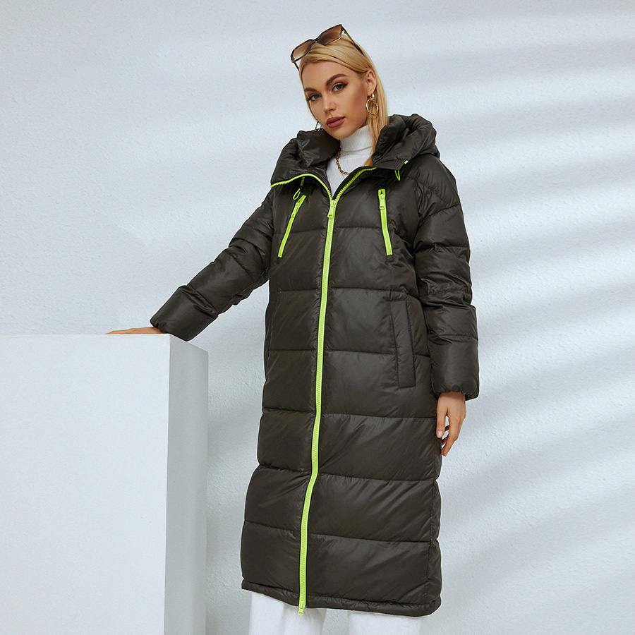 Women Quilted Puffer Long Coat Black Quilted Padded Cotton Jacket Windproof Hooded Overcoat Dark Green Long Jacket Lady Zipper Parka Coat #1070