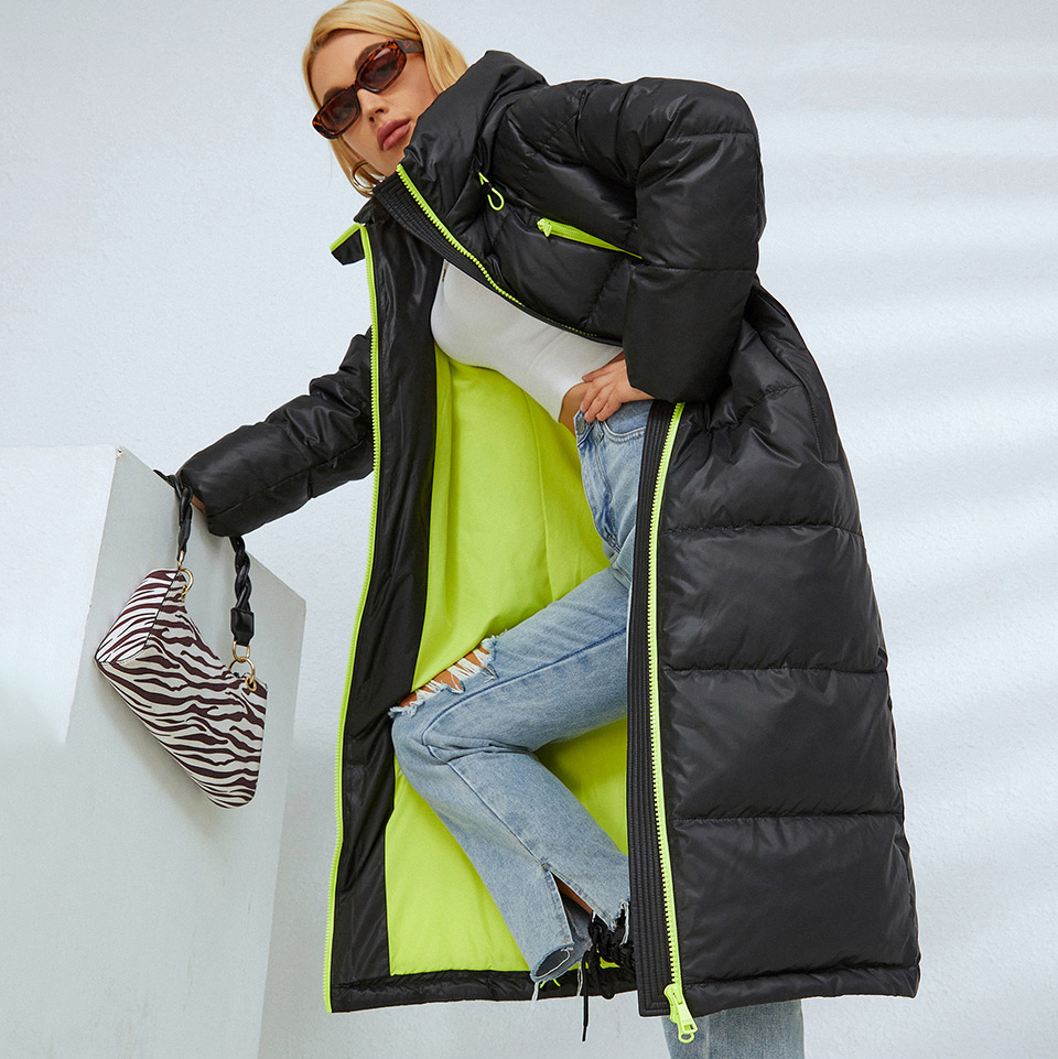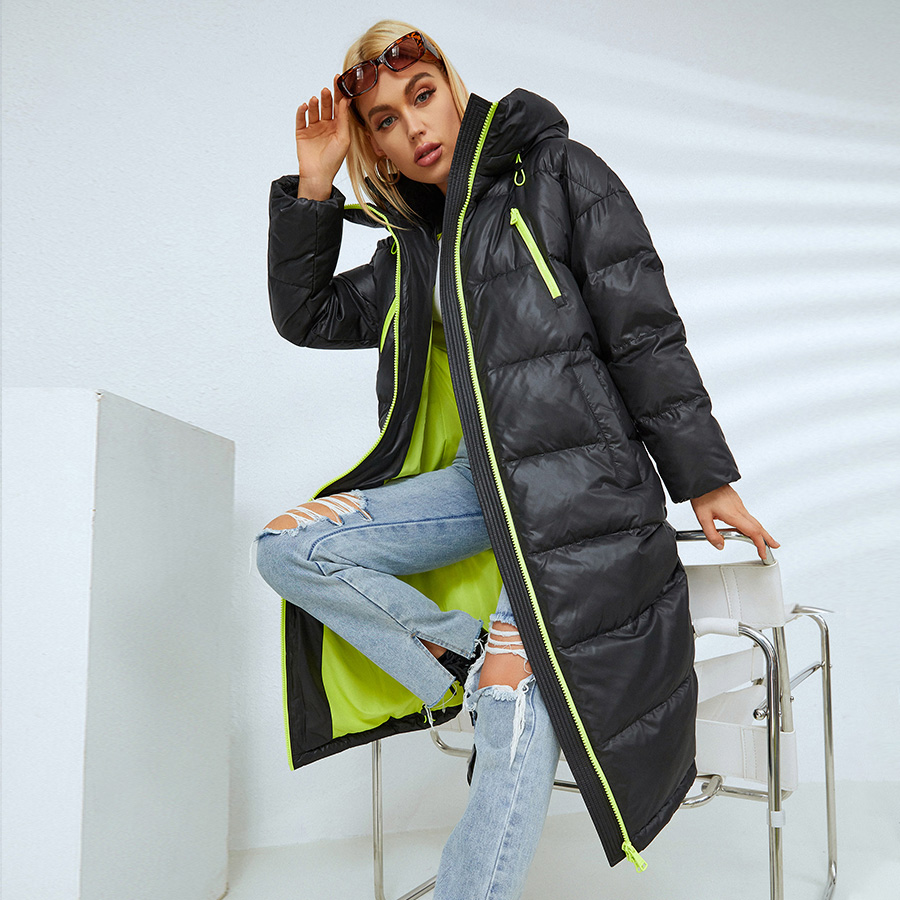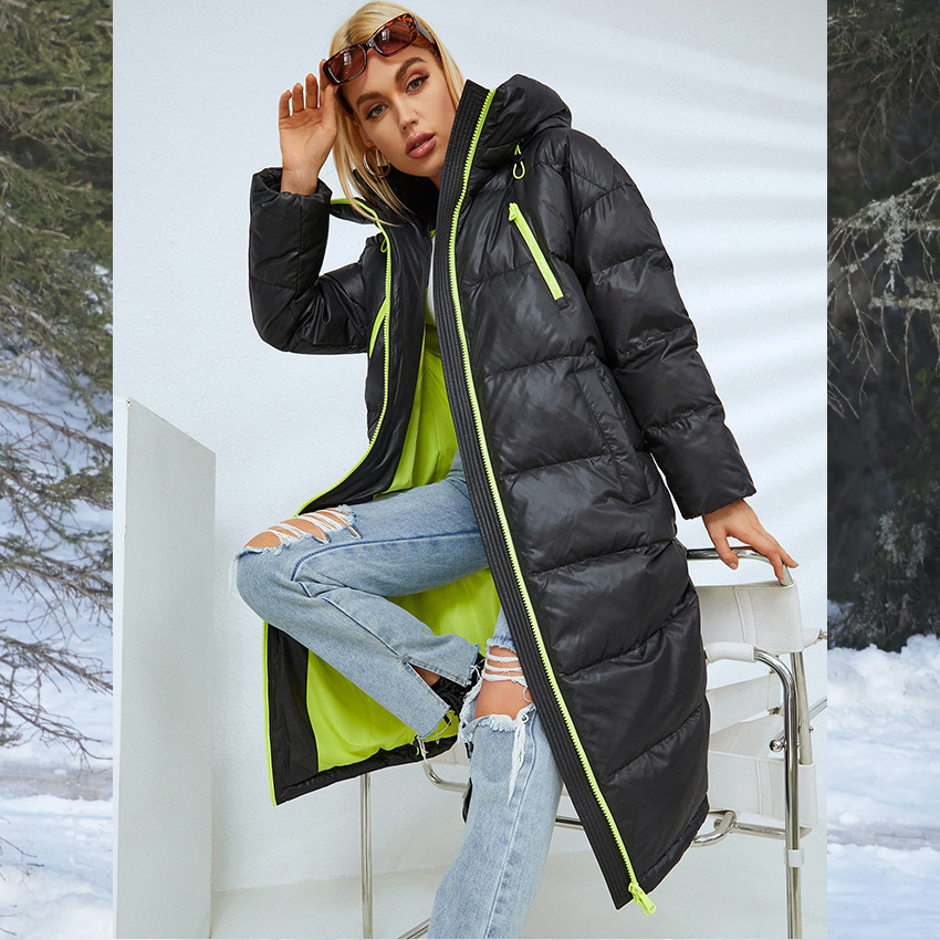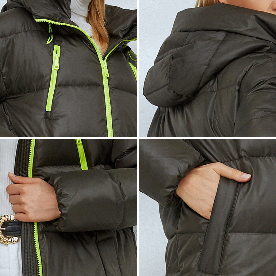 Women Quilted Puffer Long Coat Black Quilted Padded Cotton Jacket Windproof Hooded Overcoat Dark Green Long Jacket Lady Zipper Parka Coat #1070