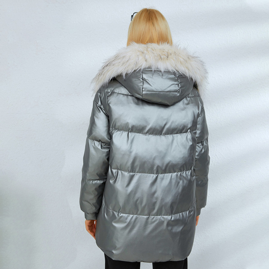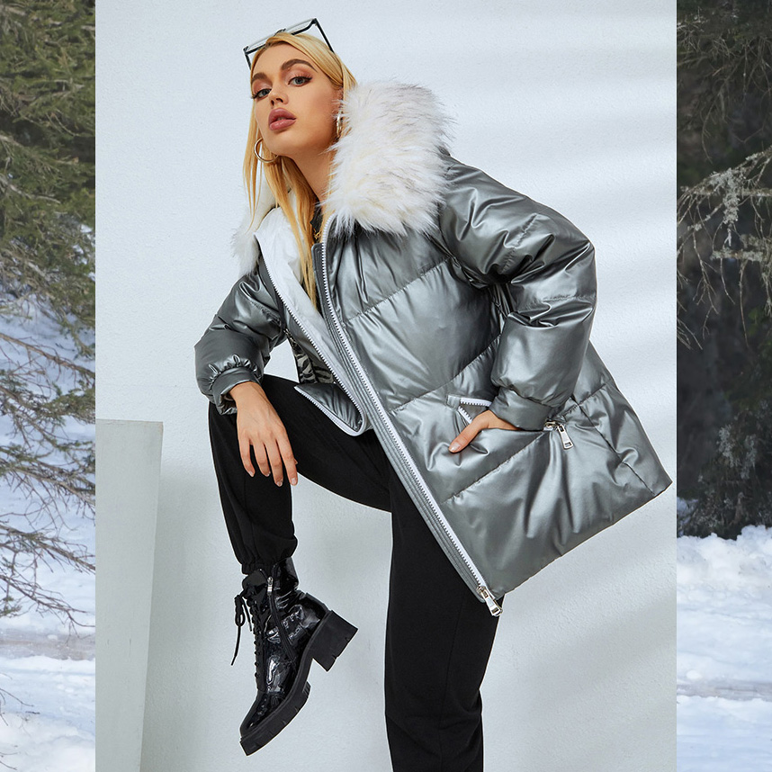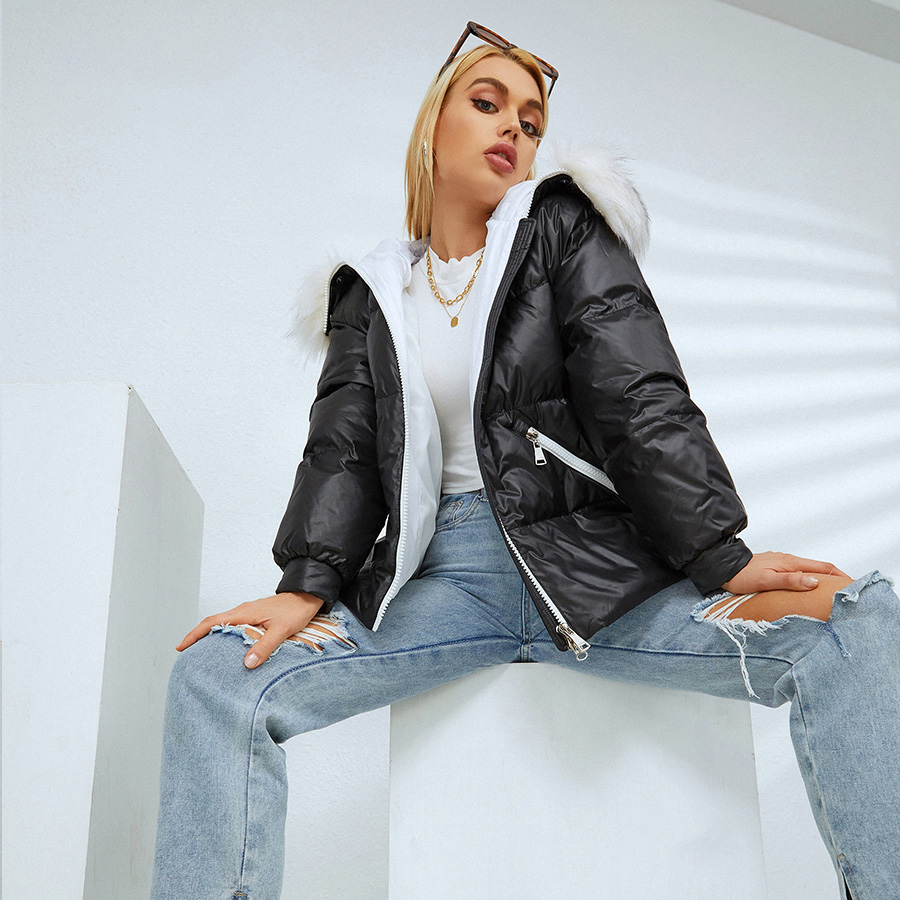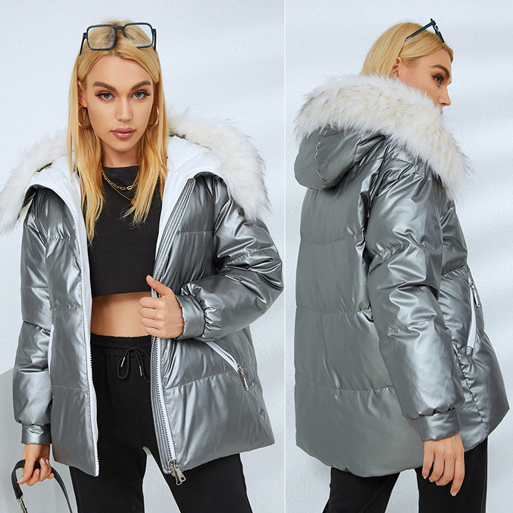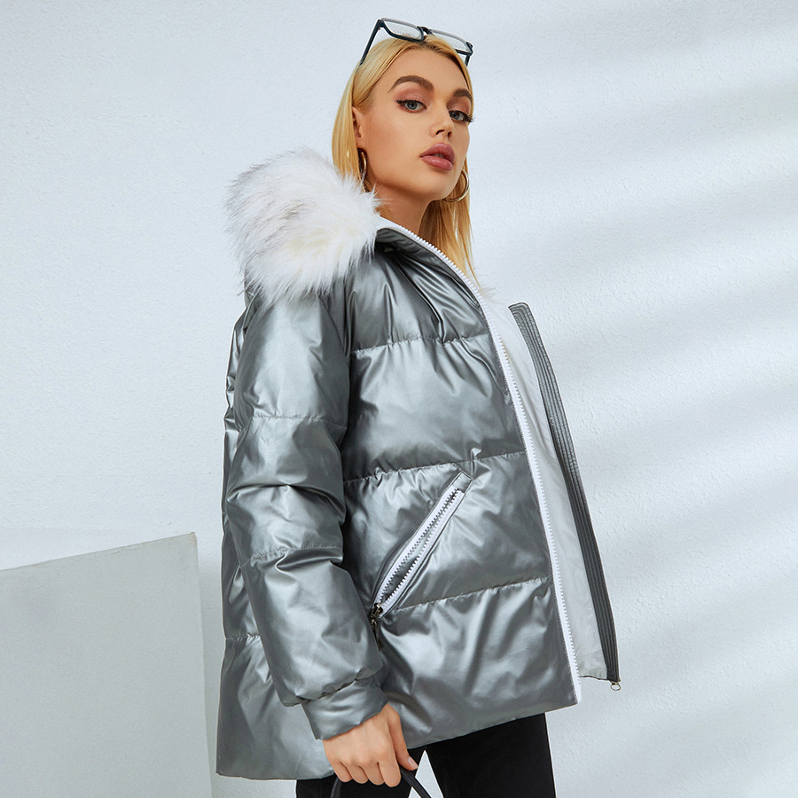 Women Warm Quilted Jacket Shiny Puffer Coat Fur Hooded Coat Casual Short Parkas Coat Hooded Overcoat Plus Size Winter Coat Blue Silver Black #1075