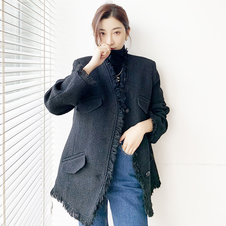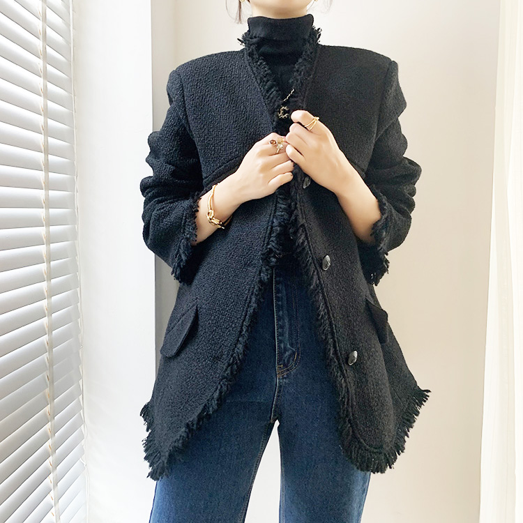 Women Black Tweed Woolen Blazer Jacket Casual Tassel Suit Female Tweed Suit Coat Autumn Coat Warm Outwear #1090