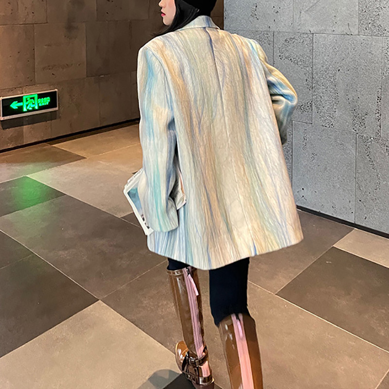 Women Stripe Wool Blazer Jacket Autumn Warm Suit Loose Wool Blends Abstract Color Stripe Print Oversize Woolen Coat #1099