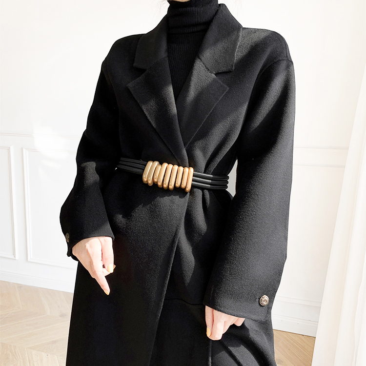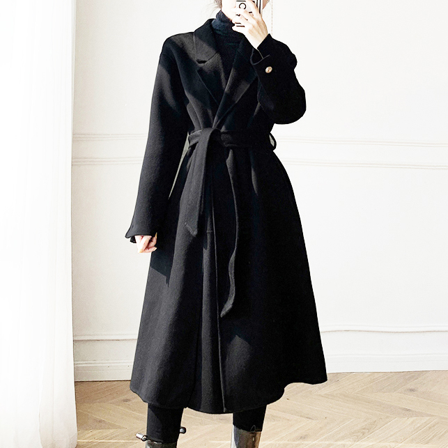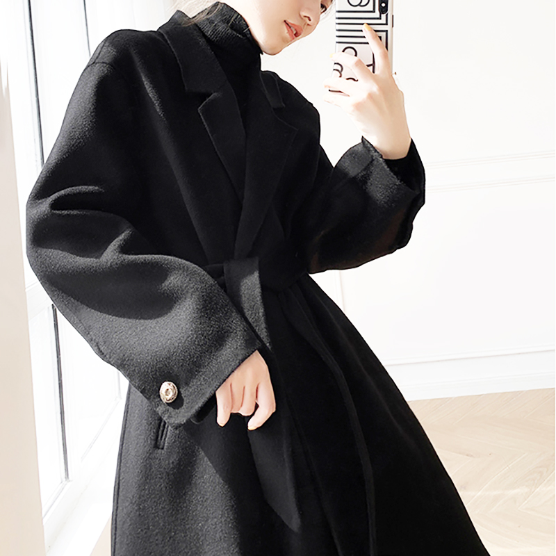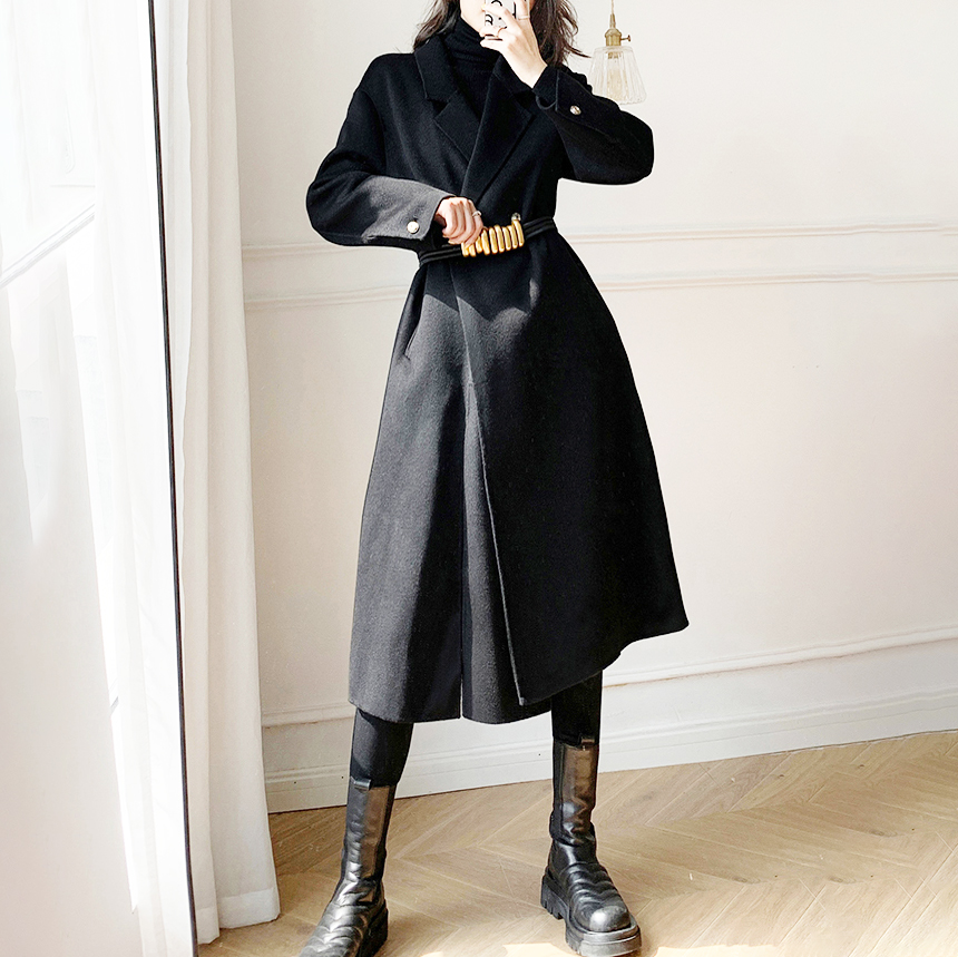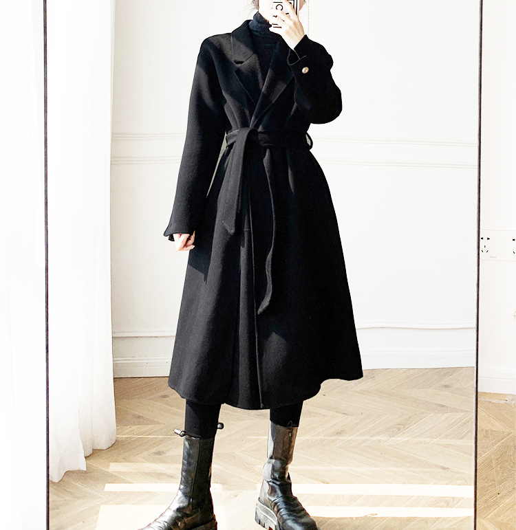 Women Black wrap Long Wool Coat Winter Warm Woolen Coat Chic Thick Woolen Black Wool Coat Hepburn Style Wool Long Coats Outwear #1108