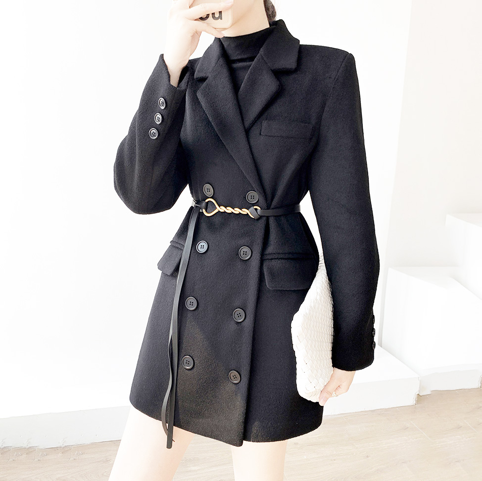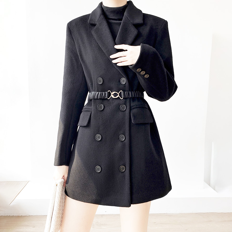 Women's Black Wool Blazer Coat Double Breasted Woolen Suit Coat Midi Length Winter Thick Wool Coat Ladies Outwear #1113