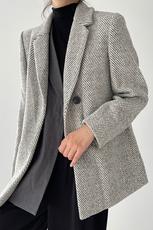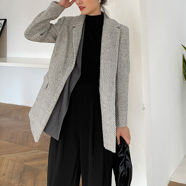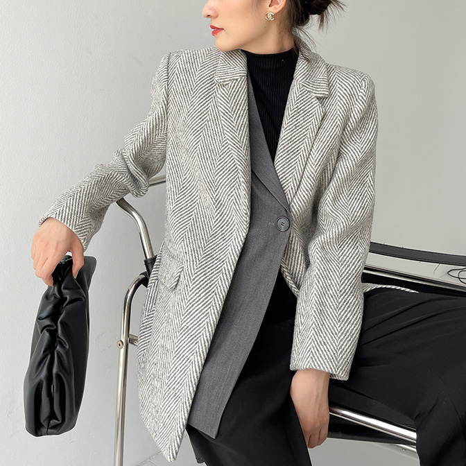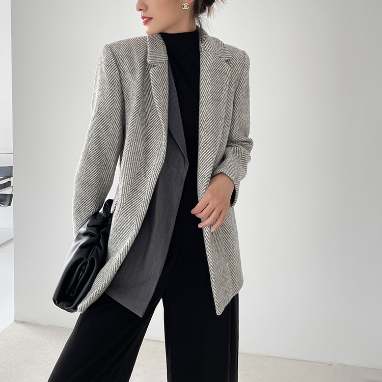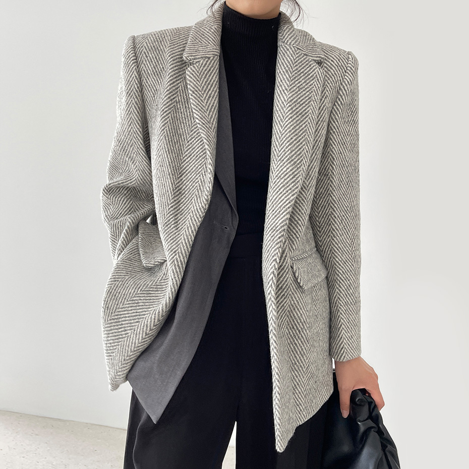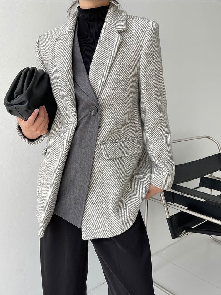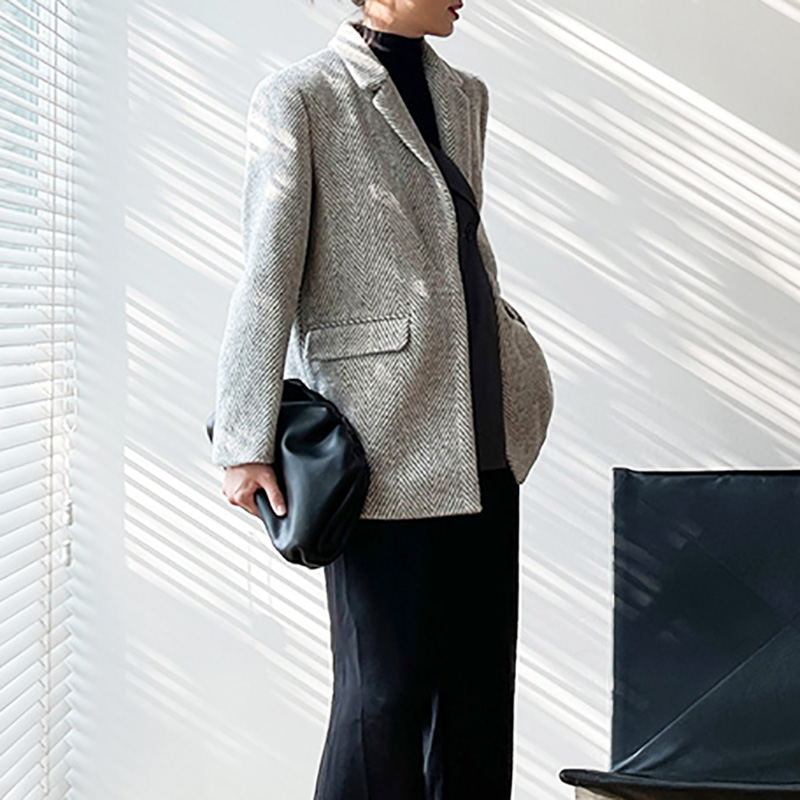 Women Grey Twill Thick Tweed Blazer Coat Office Ladies Suit Coats Autumn Blazer Suit Warm Coat One Button Blazer #1116
