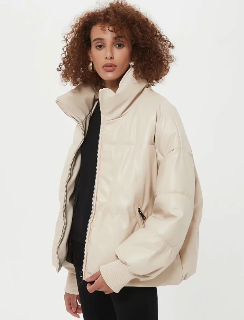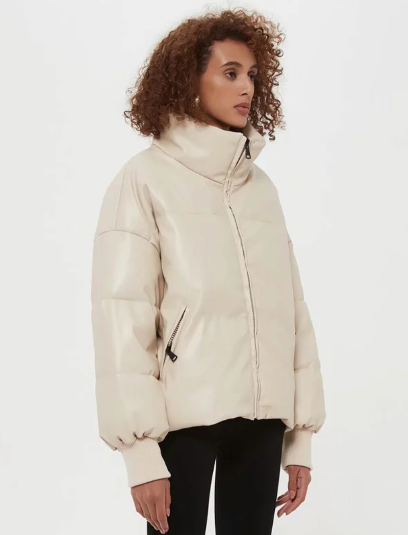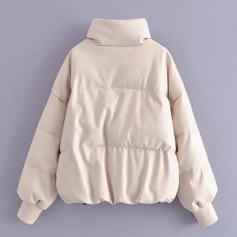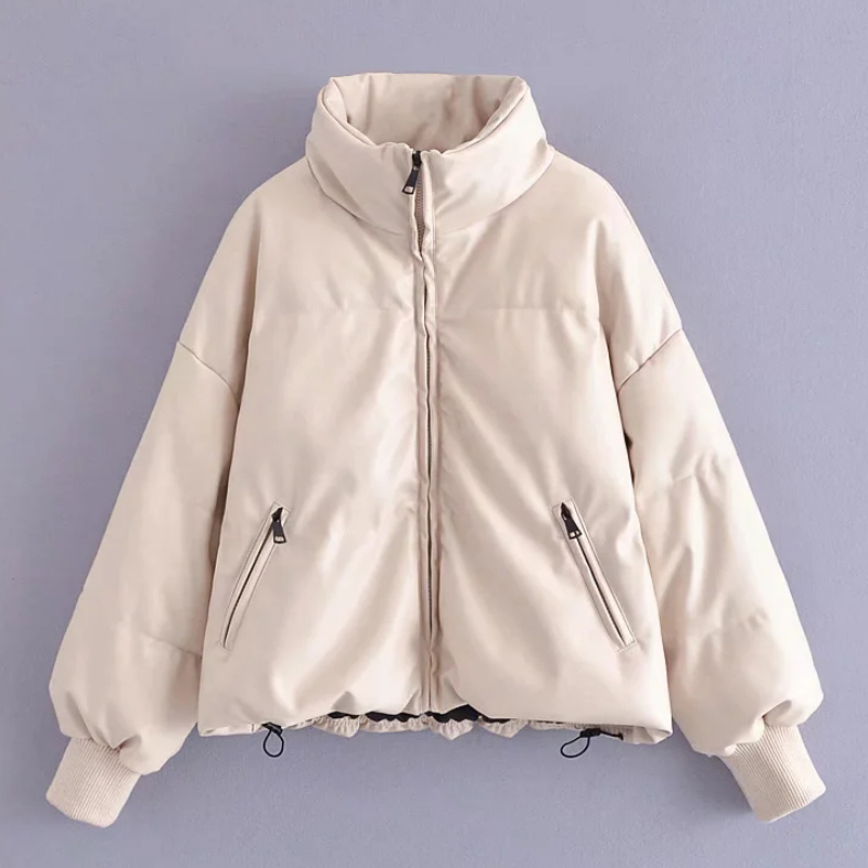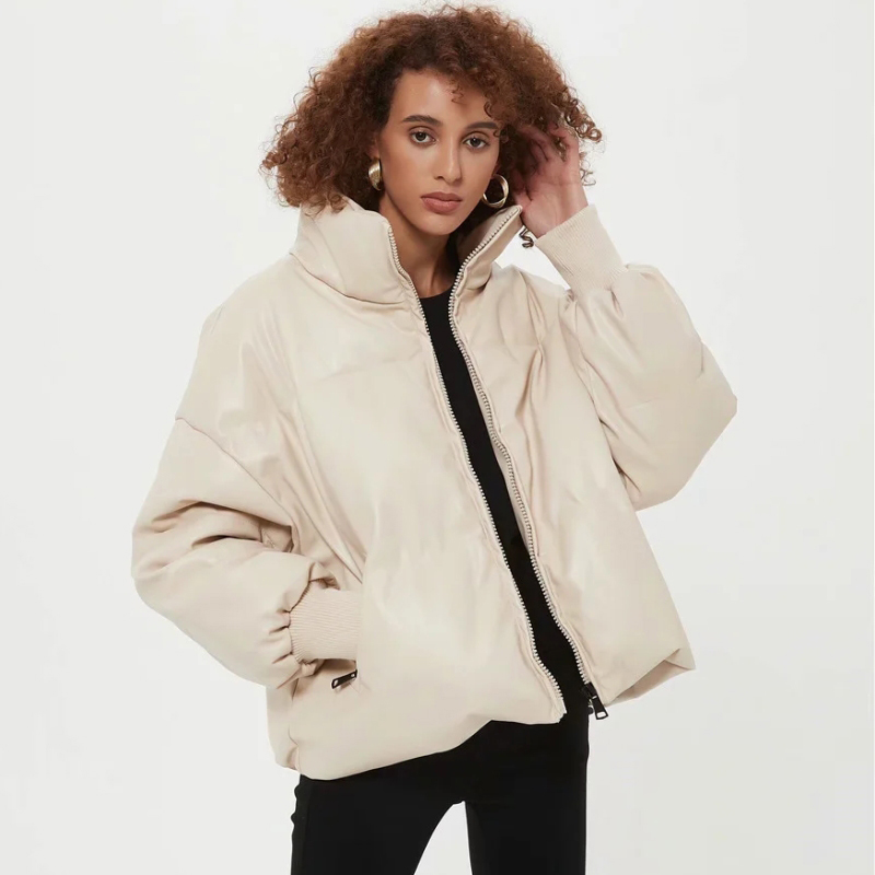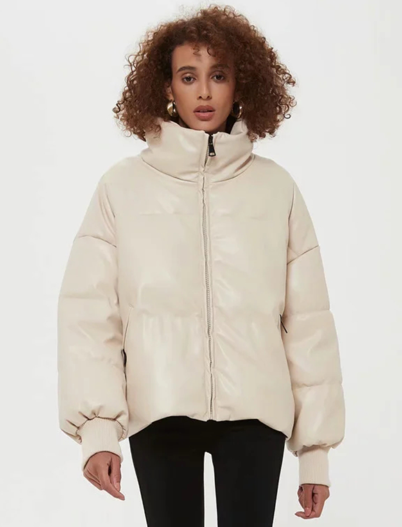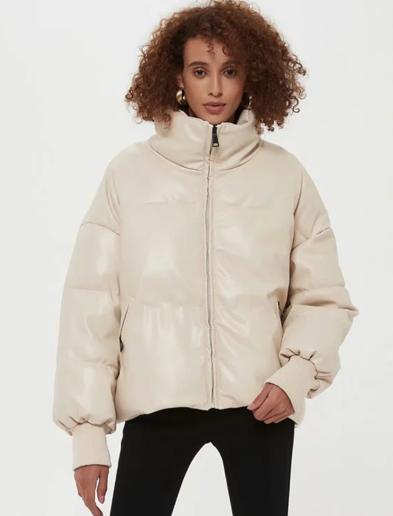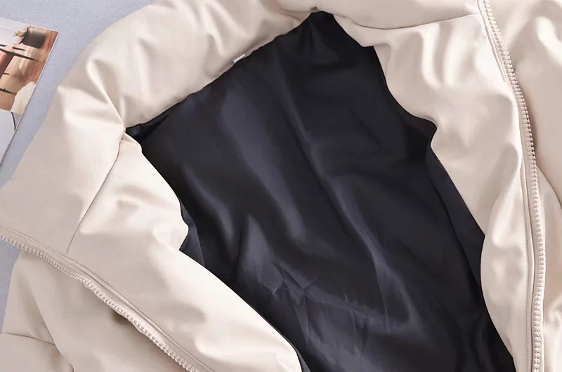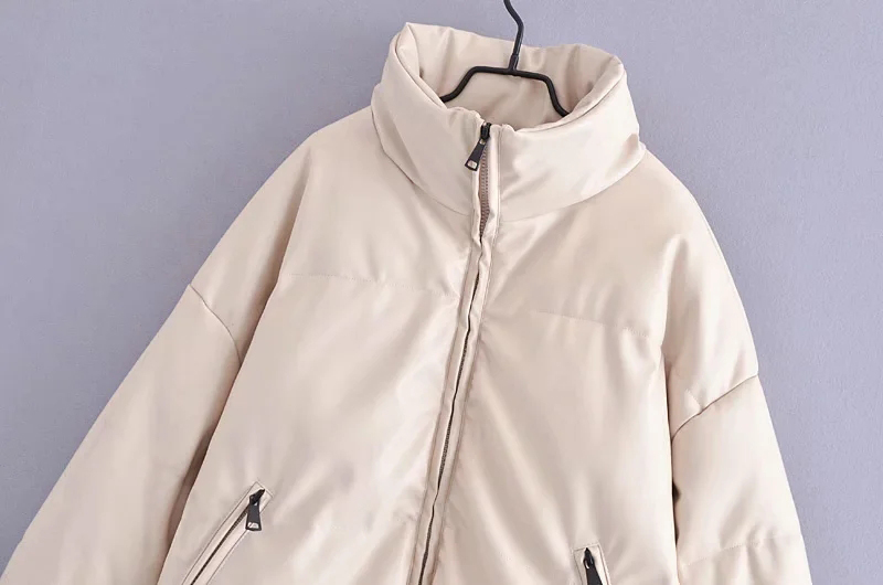 Women Beige Faux Leather Parka Coat Winter Zipper Padded Jacket Female Thick Warm PU leather Quilted Coat #1157