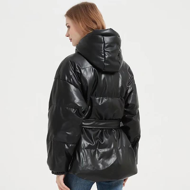 Women Black PU Leather Parkas Hooded Warm Coat Solid Faux Leather Quilted Puffer Coats Winter Thick Quilted Padded Cotton Jackets Outerwear #1163